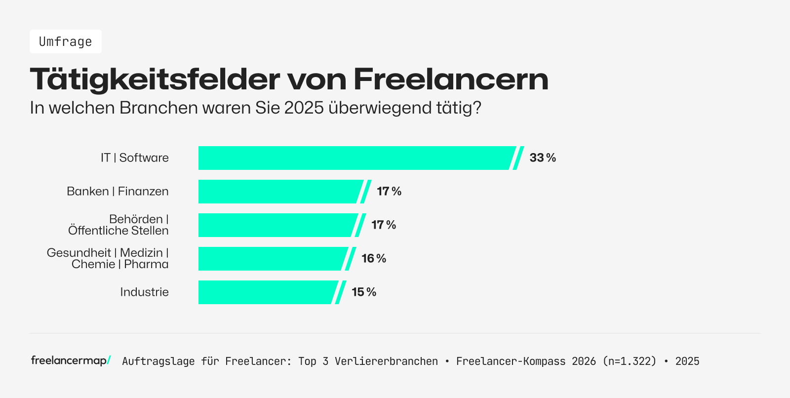 Obwohl es besonders in der IT- und Softwarebranche starke Projektrückgänge gab, gehört dieser Sektor weiterhin zu den Bereichen, in denen Freelancer laut Freelancer-Kompass 2026 am häufigsten tätig sind.