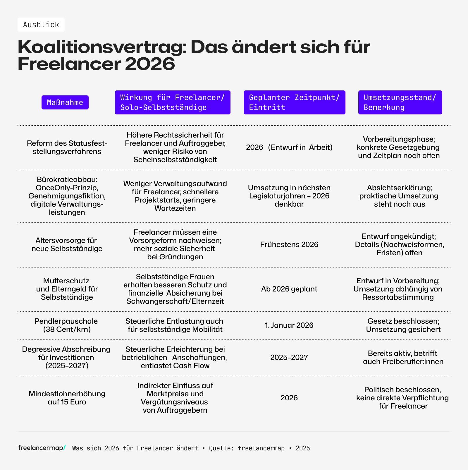 Der Koalitionsvertrag 2025 setzte deutliche politische Akzente für Selbstständige. Angekündigt wurden unter anderem: Eine Reform des Statusfeststellungsverfahrens, Abbau bürokratischer Hürden, Mutterschutzregelungen sowie steuerliche Anpassungen.