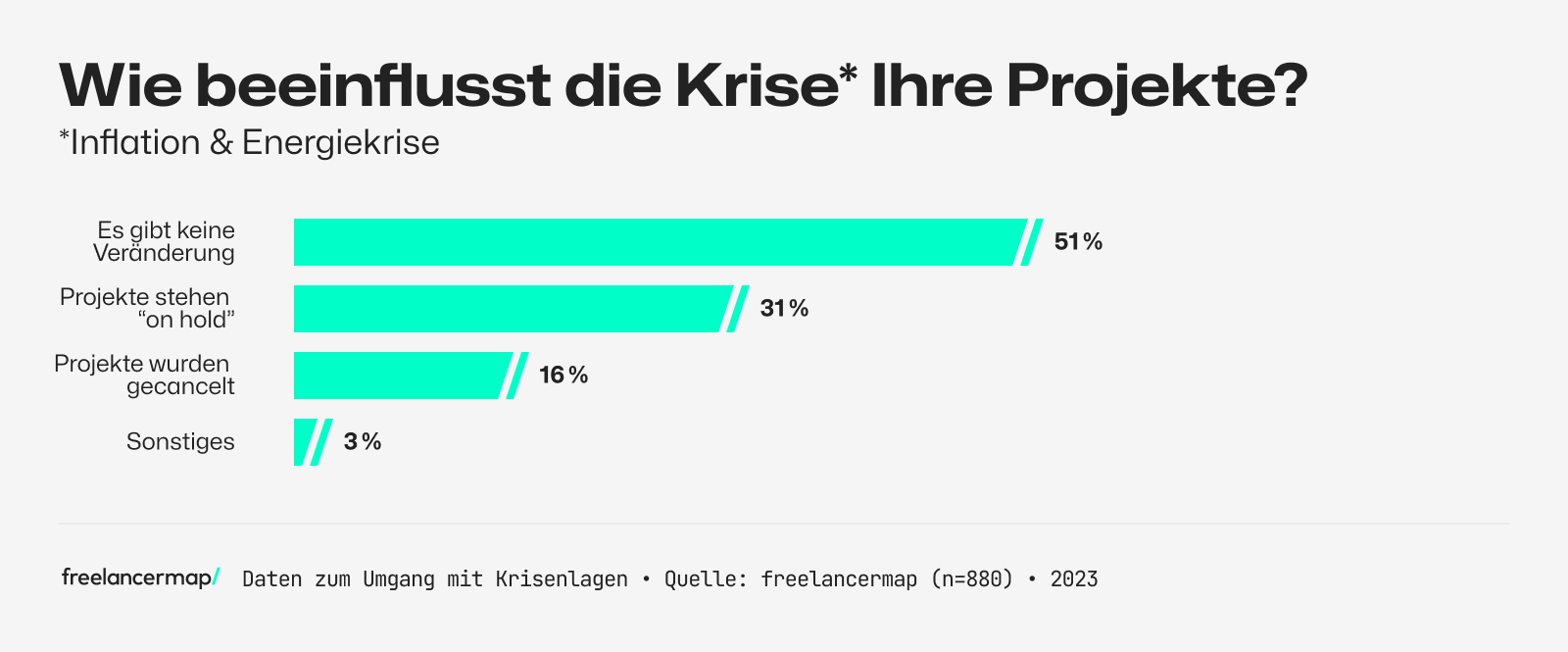• So stark beeinflussen Krisen laufende Projekte: 51 Prozent der befragten Freelancer berichten, dass sich durch Inflation oder Energiekrise nichts an ihren Projekten verändert hat. Bei rund 31 Prozent stehen einzelne Projekte jedoch auf „Hold“, während 16 Prozent sogar Projektabsagen erlebt haben.