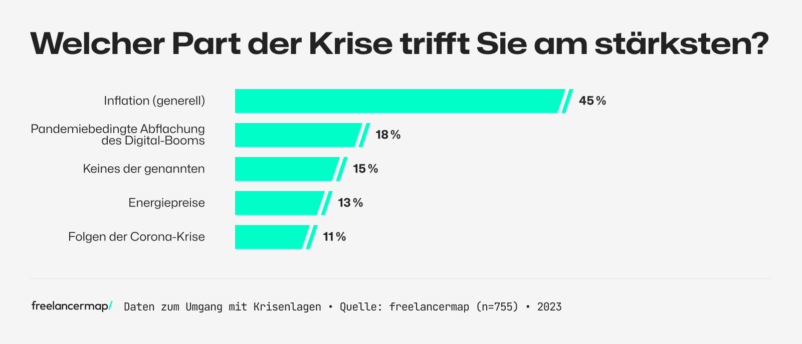 • Welche Krise Freelancer am stärksten trifft: Am stärksten spüren Freelancer derzeit die allgemeine Inflation (45 Prozent). Weitere 18 Prozent merken, dass der pandemiebedingte Digital-Boom abflacht. Energiepreise und die Folgen der Corona-Krise spielen dagegen eine geringere Rolle.