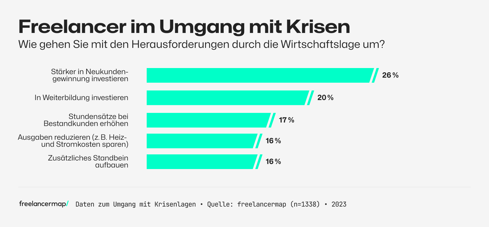 • So reagieren Freelancer auf die wirtschaftliche Lage: Viele Freelancer begegnen schwierigen Wirtschaftslagen mit aktivem Handeln. 26 Prozent investieren stärker in die Neukundengewinnung, weitere 20 Prozent setzen auf Weiterbildung. Etwa gleich viele reagieren mit Sparmaßnahmen oder bauen zusätzliche Standbeine auf.