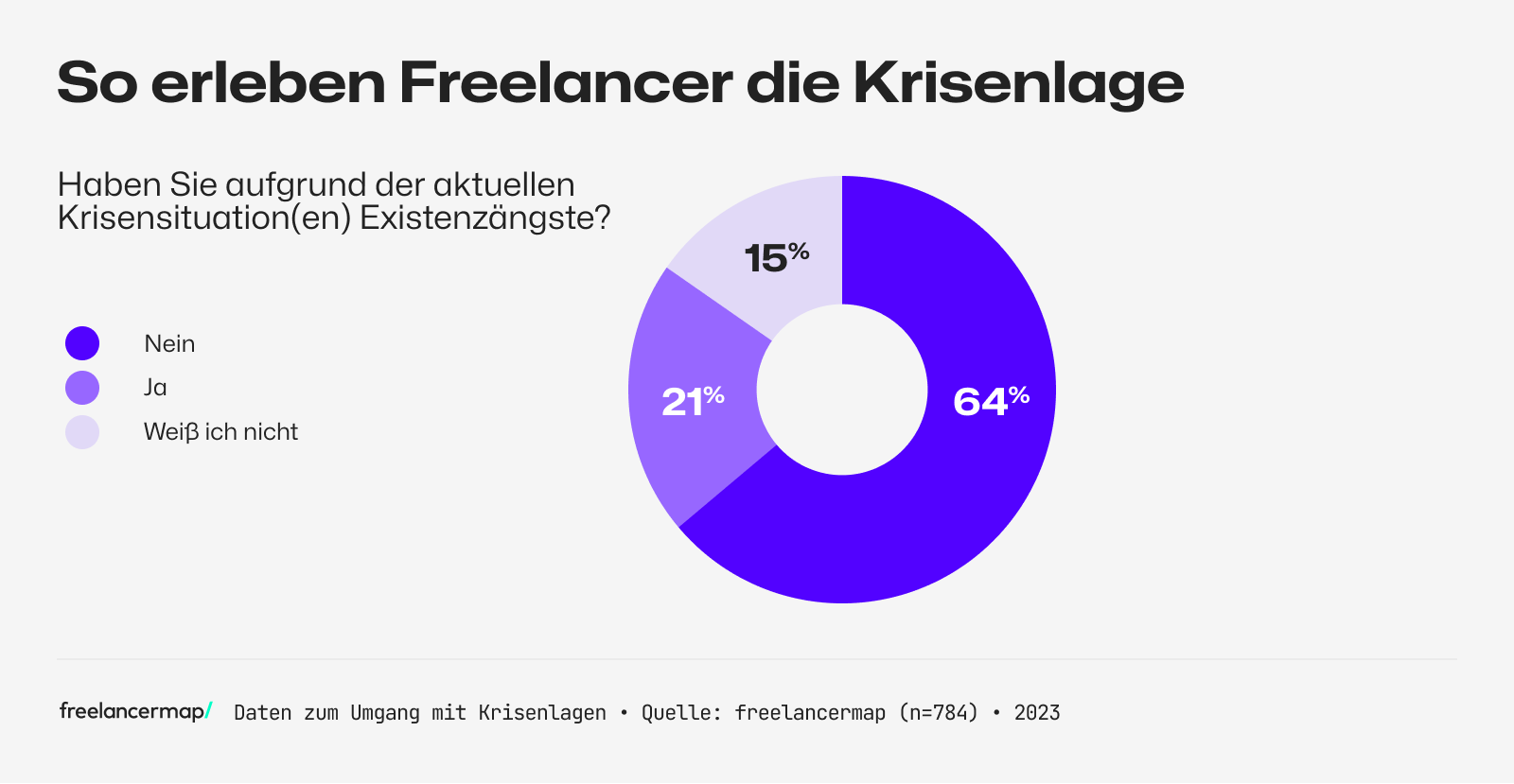 • So nehmen Freelancer die Krisenlage wahr: Die Mehrheit der Freelancer zeigt sich trotz der wirtschaftlich angespannten Situation gefasst. 64 Prozent geben an, keine Existenzängste zu haben, während 21 Prozent der Befragten ihre finanzielle Lage als besorgniserregend empfinden.