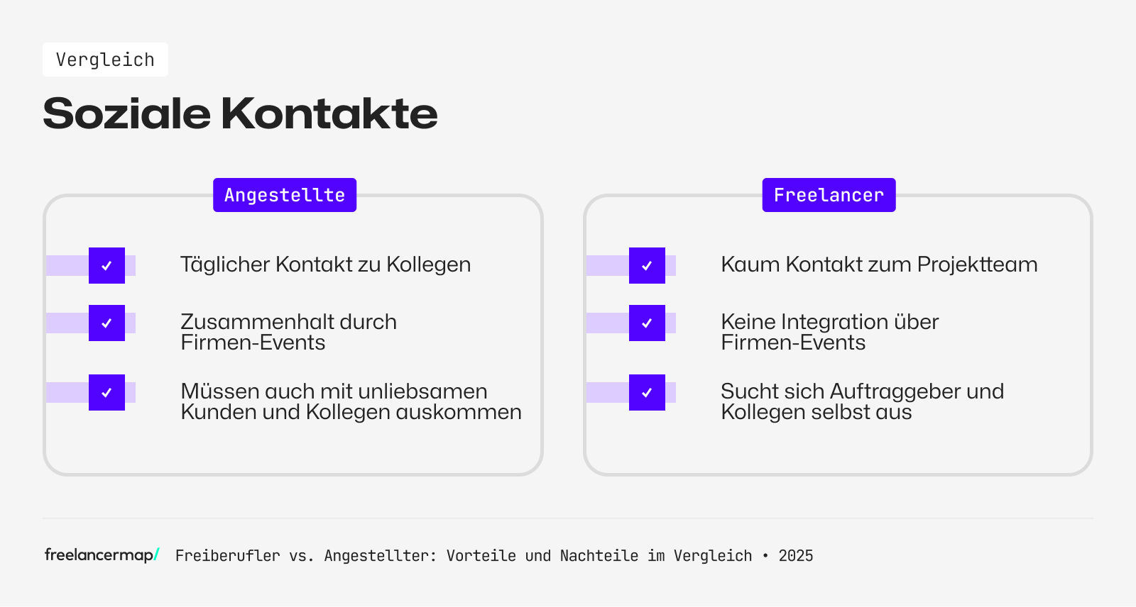 | Arbeitsklima | (+/–) Teamgeist möglich, aber auch Konflikte mit Kollegen oder Vorgesetzten | (+) Kunden/Auftraggeber frei wählbar, Konflikte lassen sich leichter beenden |