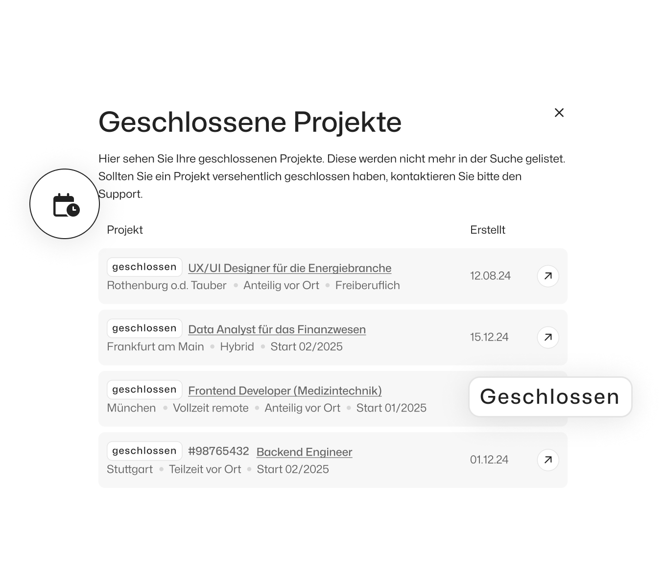 Sie haben jemanden für Ihr Projekt gefunden? Herzlichen Glückwunsch! Nun können Sie das Projekt schließen. Offene Konversationen erhalten automatisch eine Absage. So geben Sie den Bewerbern Feedback, vermeiden Rückfragen und halten Ihr Postfach aufgeräumt – mit nur einem Klick!