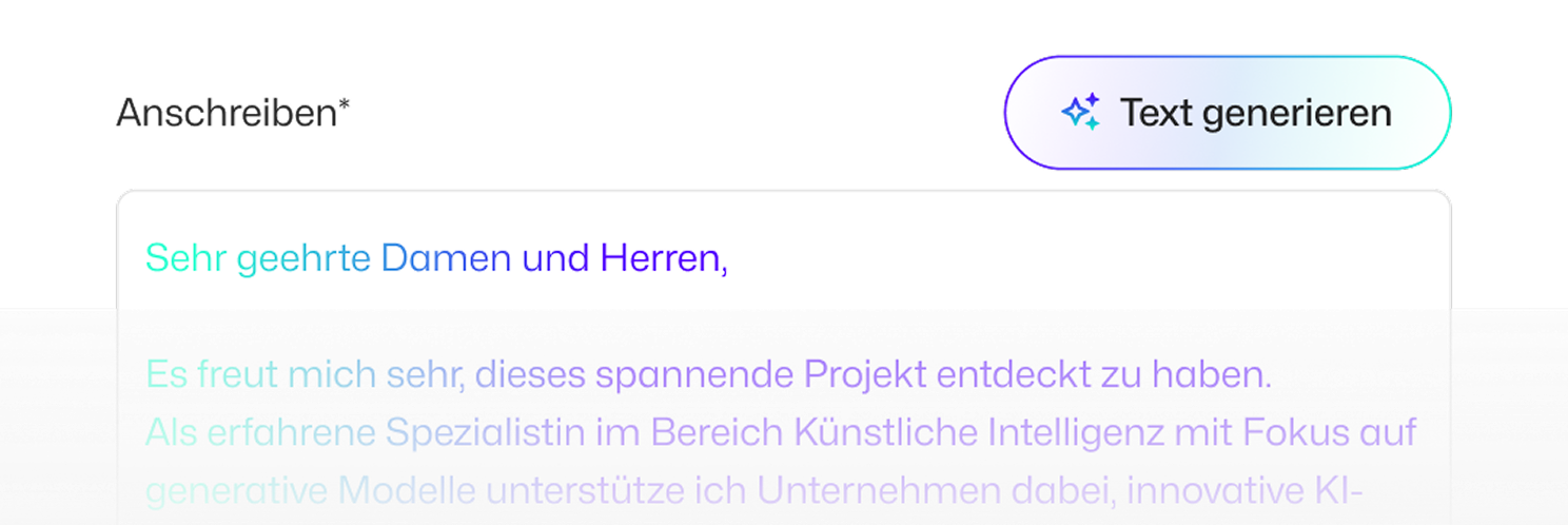 Unser KI-Assistent analysiert Ihr Profil, vergleicht es mit dem Projekt und erstellt daraus ein maßgeschneidertes Anschreiben – abgestimmt auf Ihre Erfahrungen, Stärken und relevante Schnittmengen mit dem Projekt.